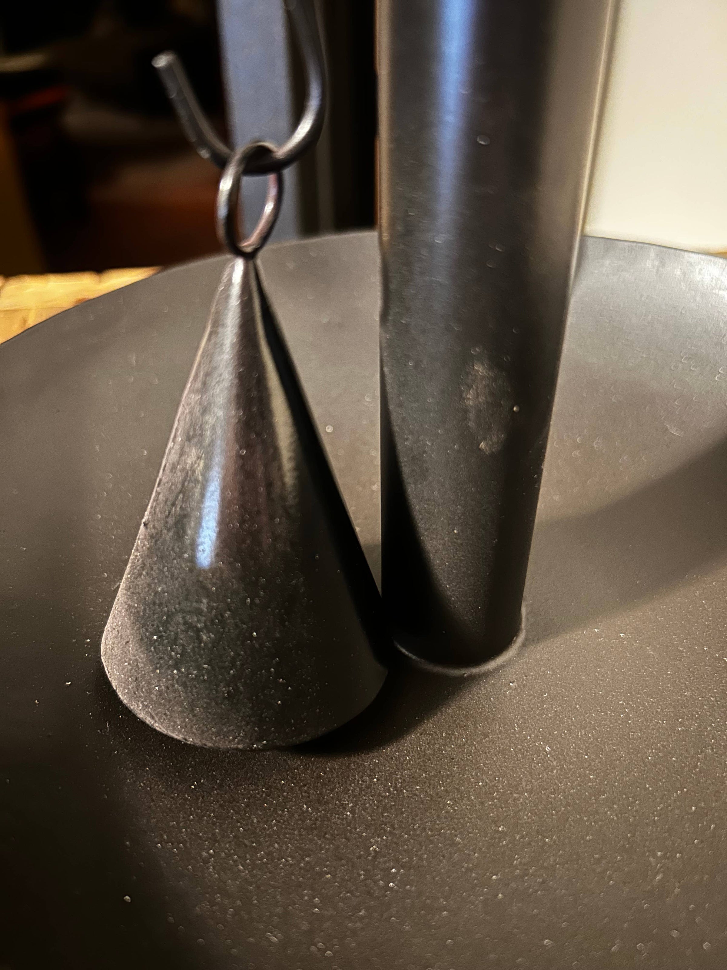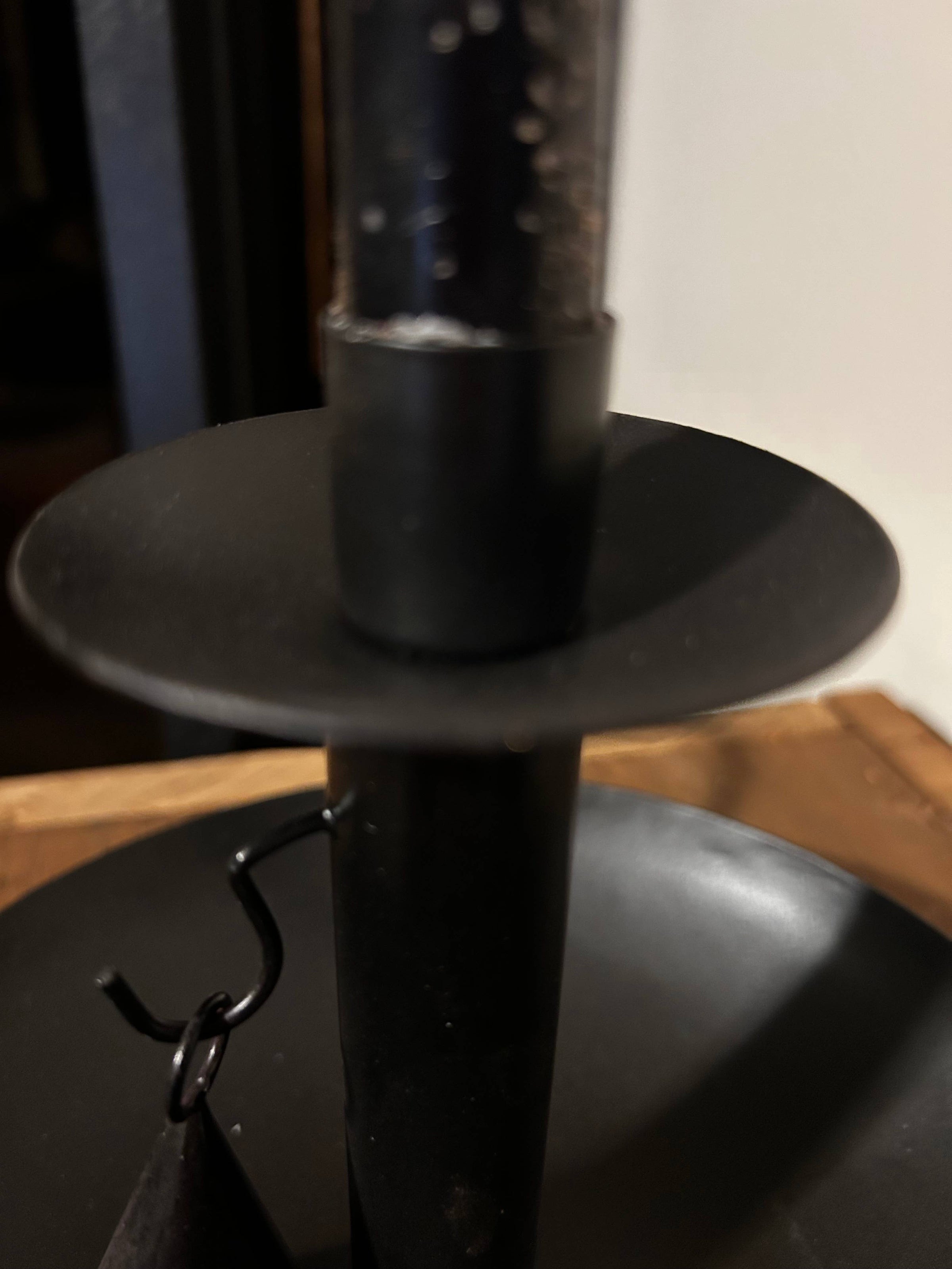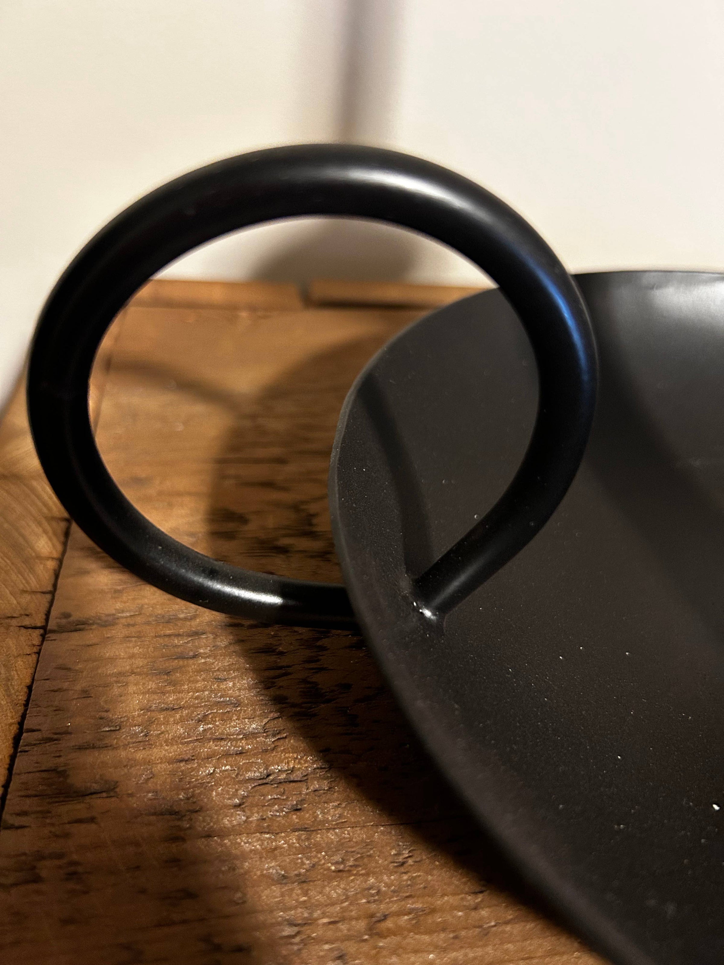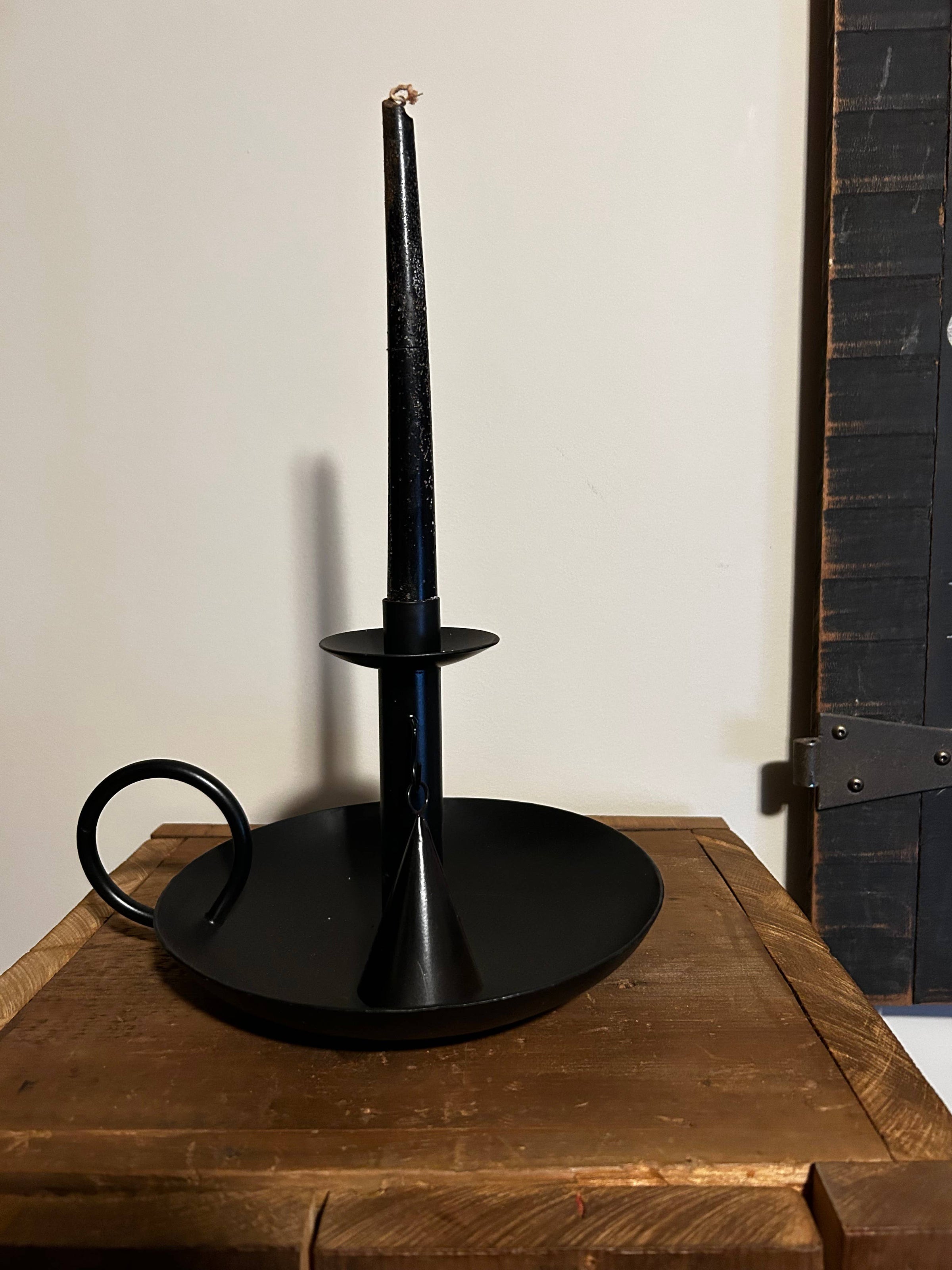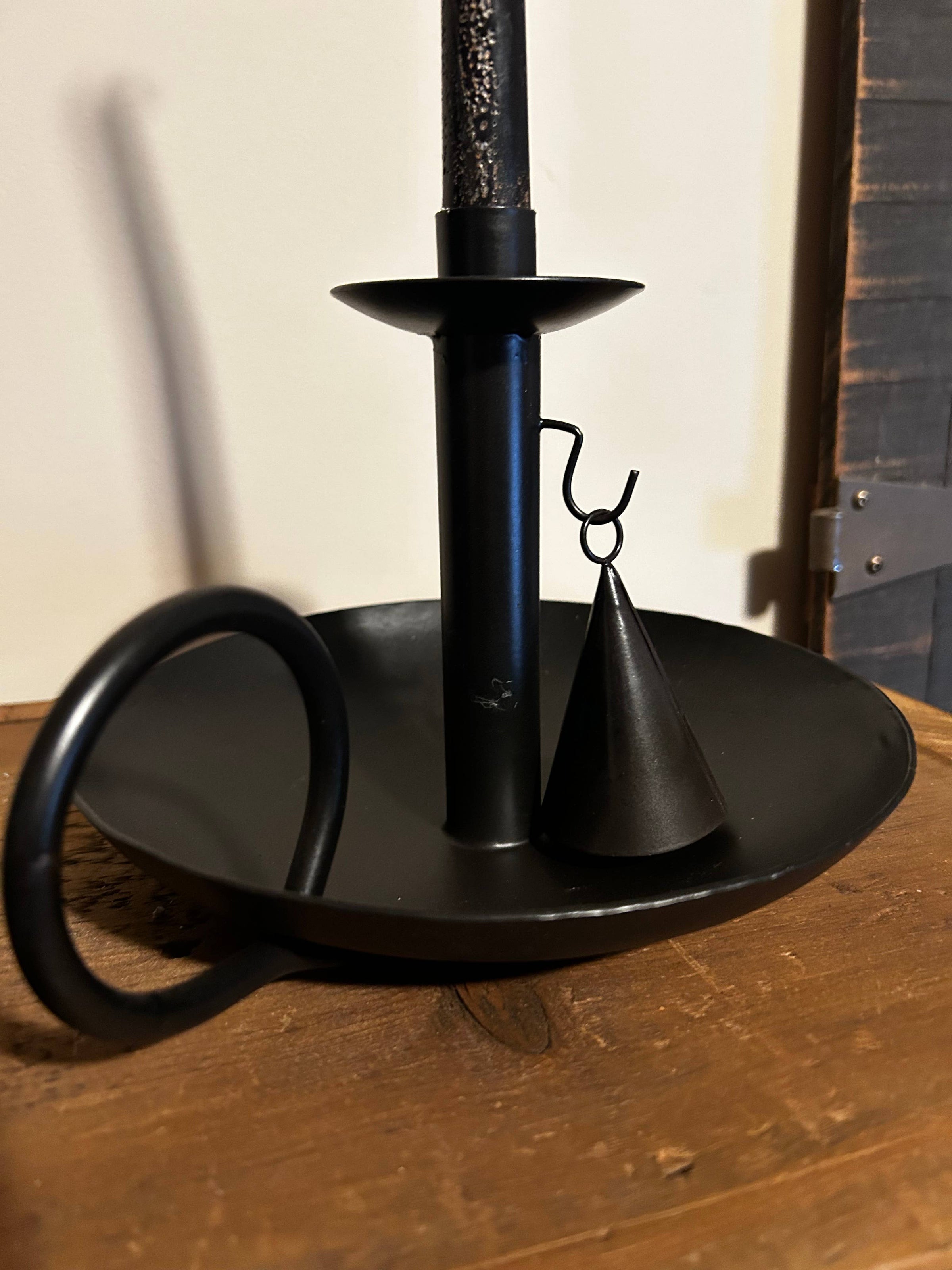 Viddles is a slang term for food. Often times people would use what they had to create useful items - a way to "make do" with what they had. Many bowls of any sort were used for whatever need arose. Hand hammered bowls were often found created to hold candlesticks when the bowl had been worn and would no longer hold liquids. This black metal replica helps us to appreciate our history. 9"x8"x6.5" Snuffer included. Candle is not included.