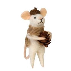 Felted Mouse with Beige Scarf Ornament is a plush ornament made of felt material. Mouse wears an acorn hat, burlap scarf, and he clutches a pinecone in both hands for detail. Ornament comes ready to hang and it makes a unique addition to a Christmas tree or it can be hung from a hook or nail. Measures 5" high.