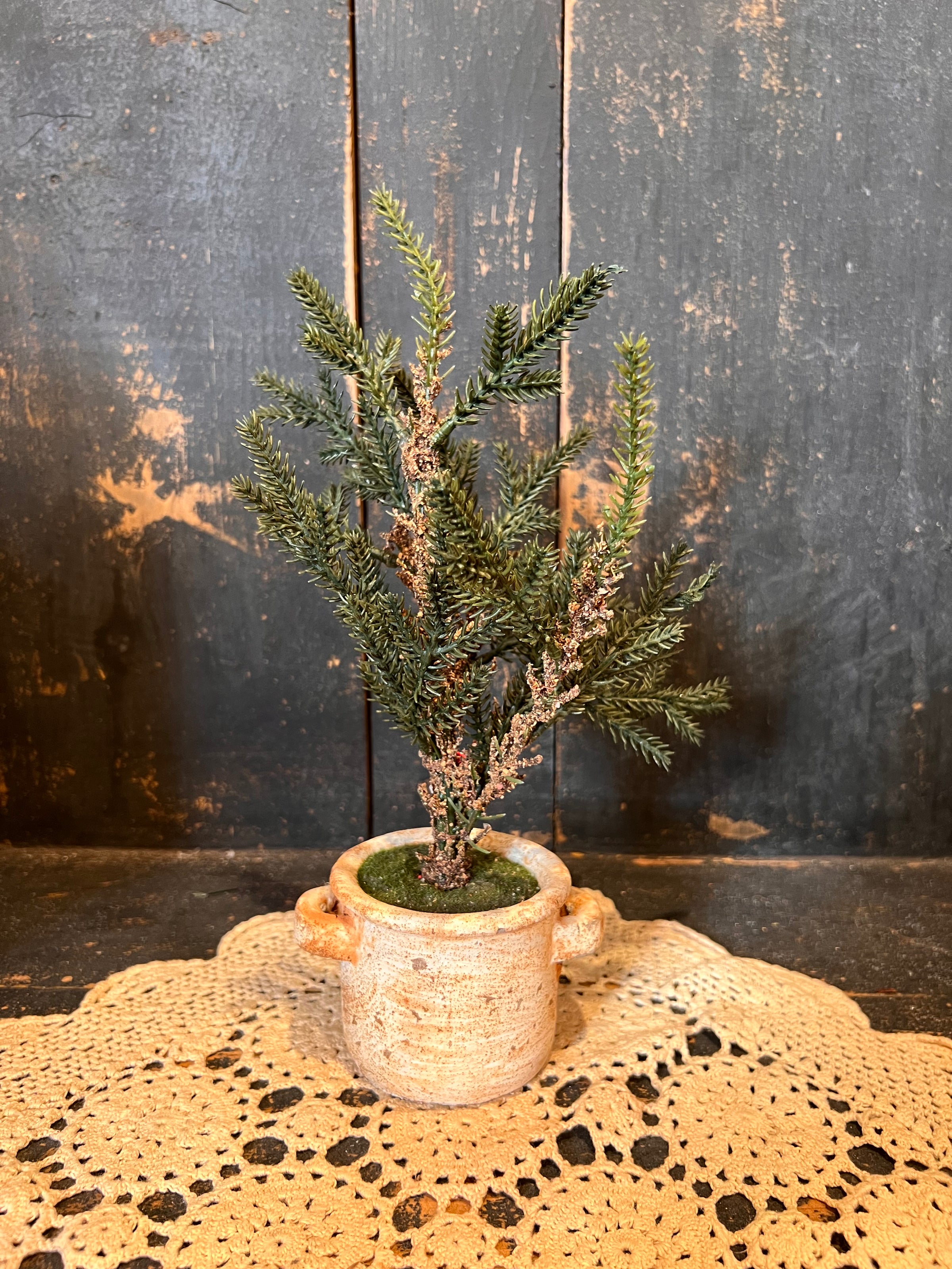 Green tree in aged unique pot