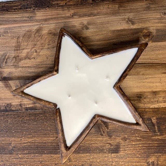The Star Candle is a fun and unique design hand crafted from Spanish Oak. Hand poured with 100% Soy Wax. Approximate size 12x12x2 inches.