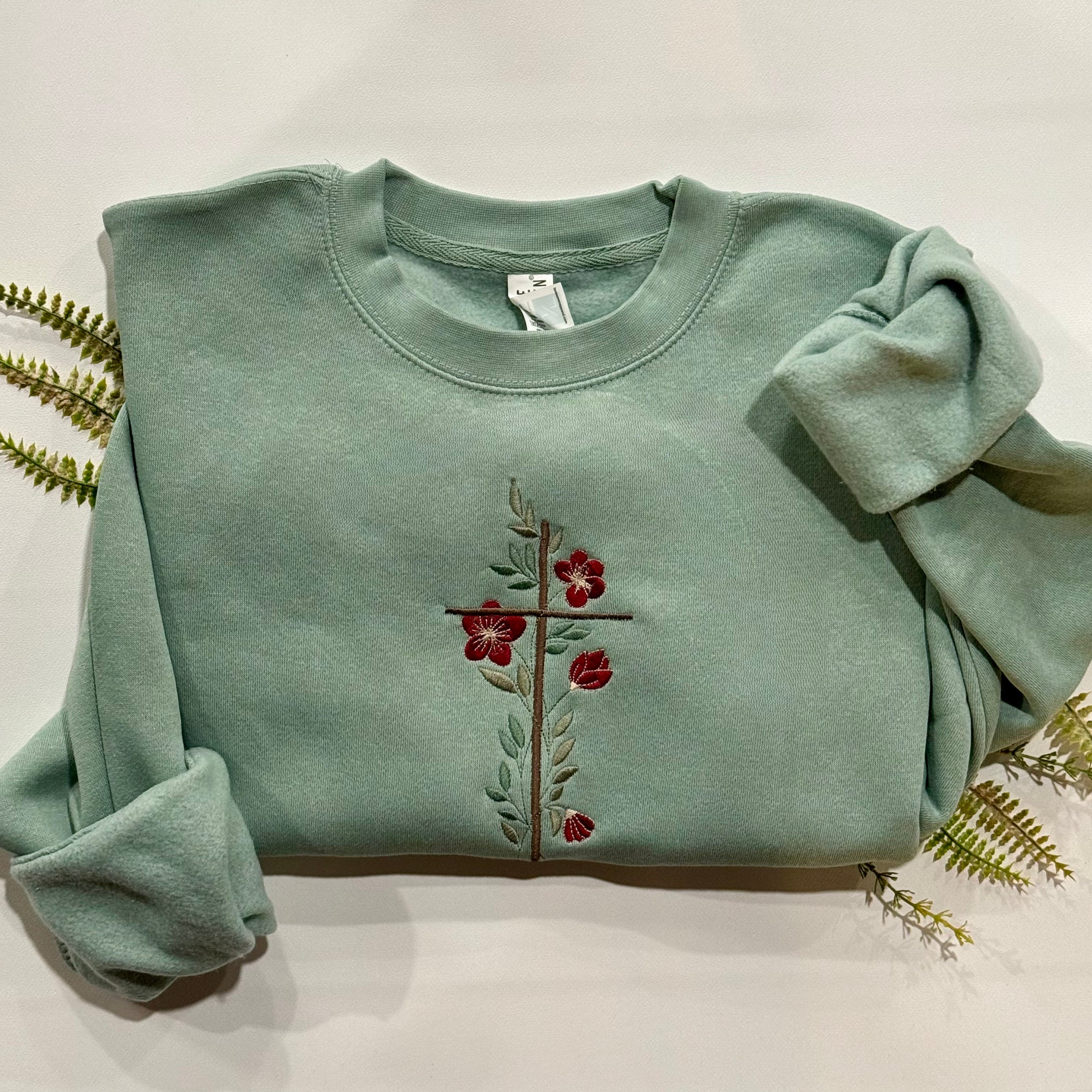 This embroidered premium crewneck from Lane Seven features a beautiful floral cross.