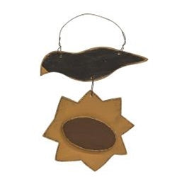 Primitive Crow & Sunflower Ornament is a USA made ornament with a primitive design. Ornament features a wooden crow and sunflower with a distressed finish for a rustic feel and it is easily hung from hooks, nails, or knobs as part of seasonal decorating. Measures 7.5" high by 6.5" wide by .25" deep.