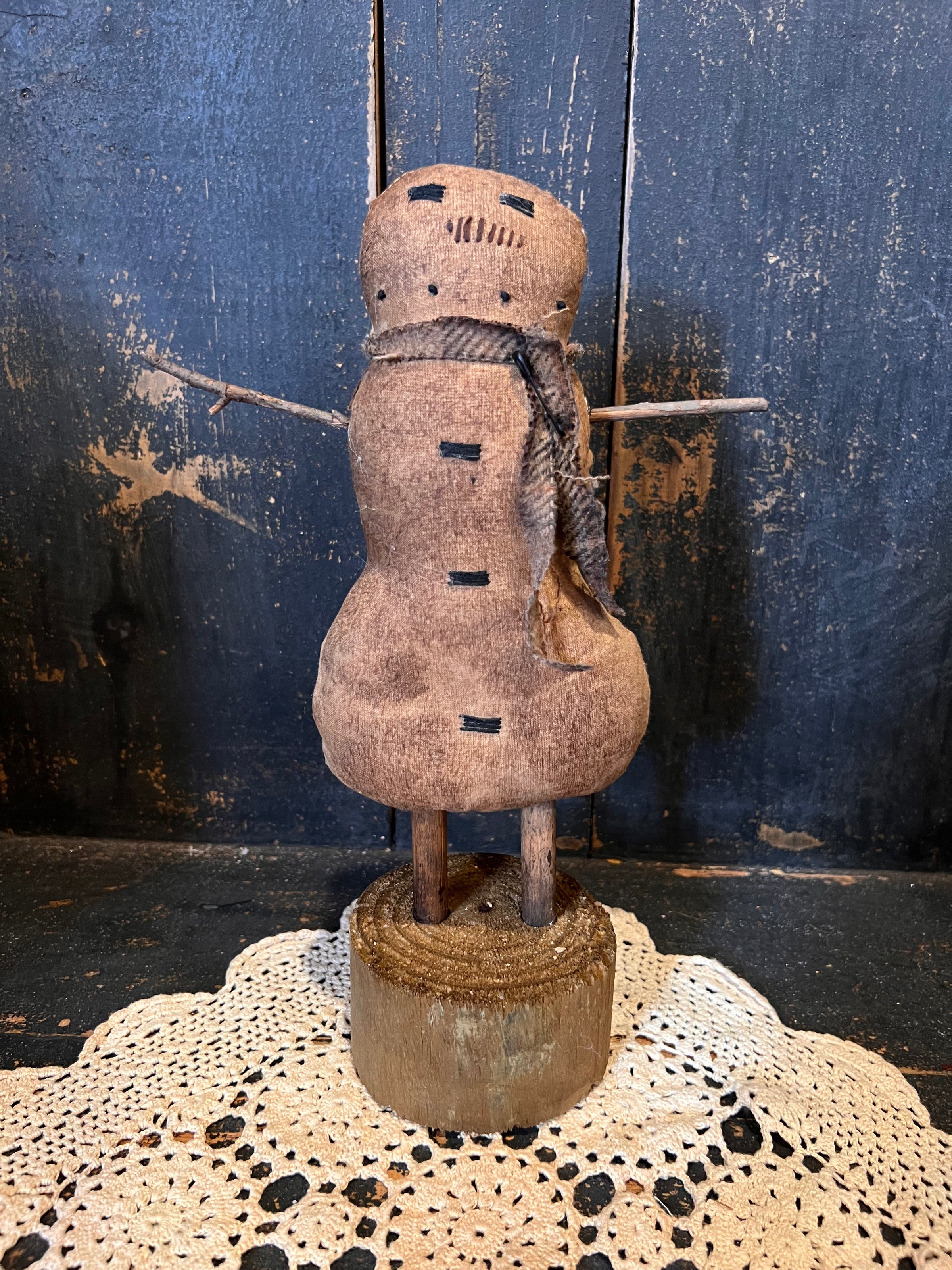 12" H handmade primitive snowgirl  features a hand stitched face, fabric scarf and stick arms