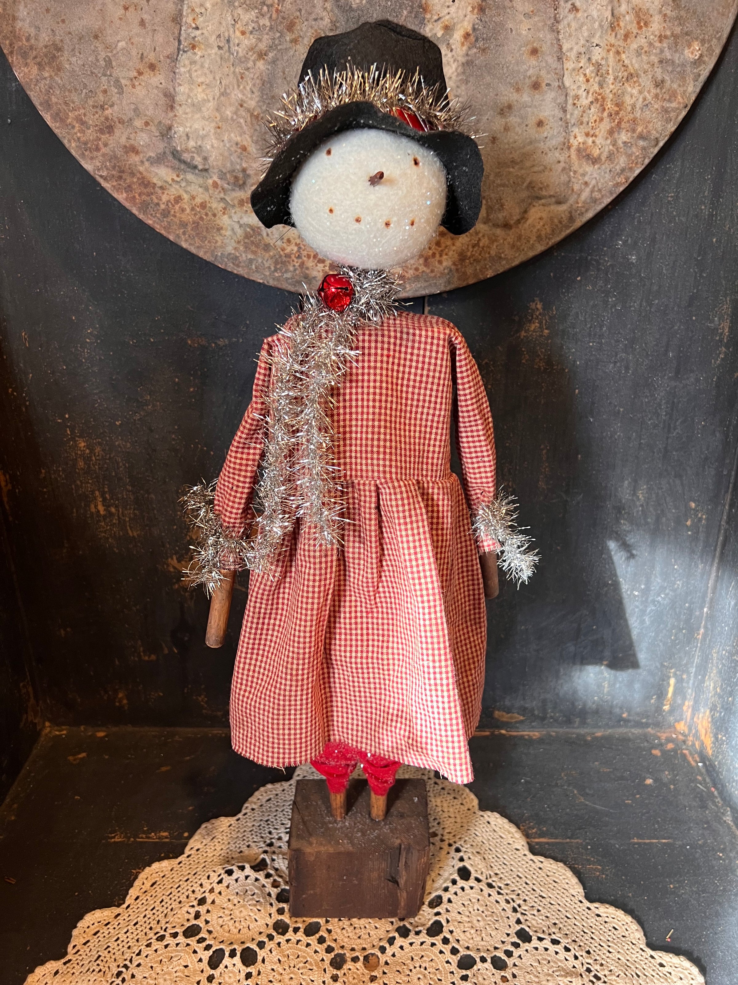 This unique handmade one of a kind snowman is perfectly dressed in primitive clothes