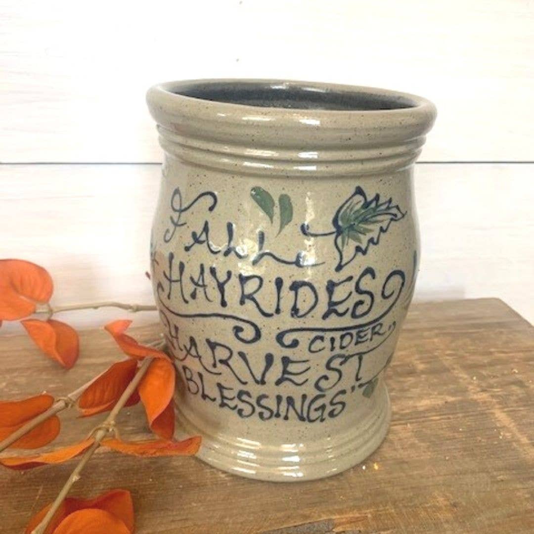This elegant curved vessel is finished in our liquid gold glaze wiht our Fall Harvest sentiment. In our warm liquid gold glaze, it’s the perfect seasonal update filled with fall florals, kitchen utensils or a bottle of wine.