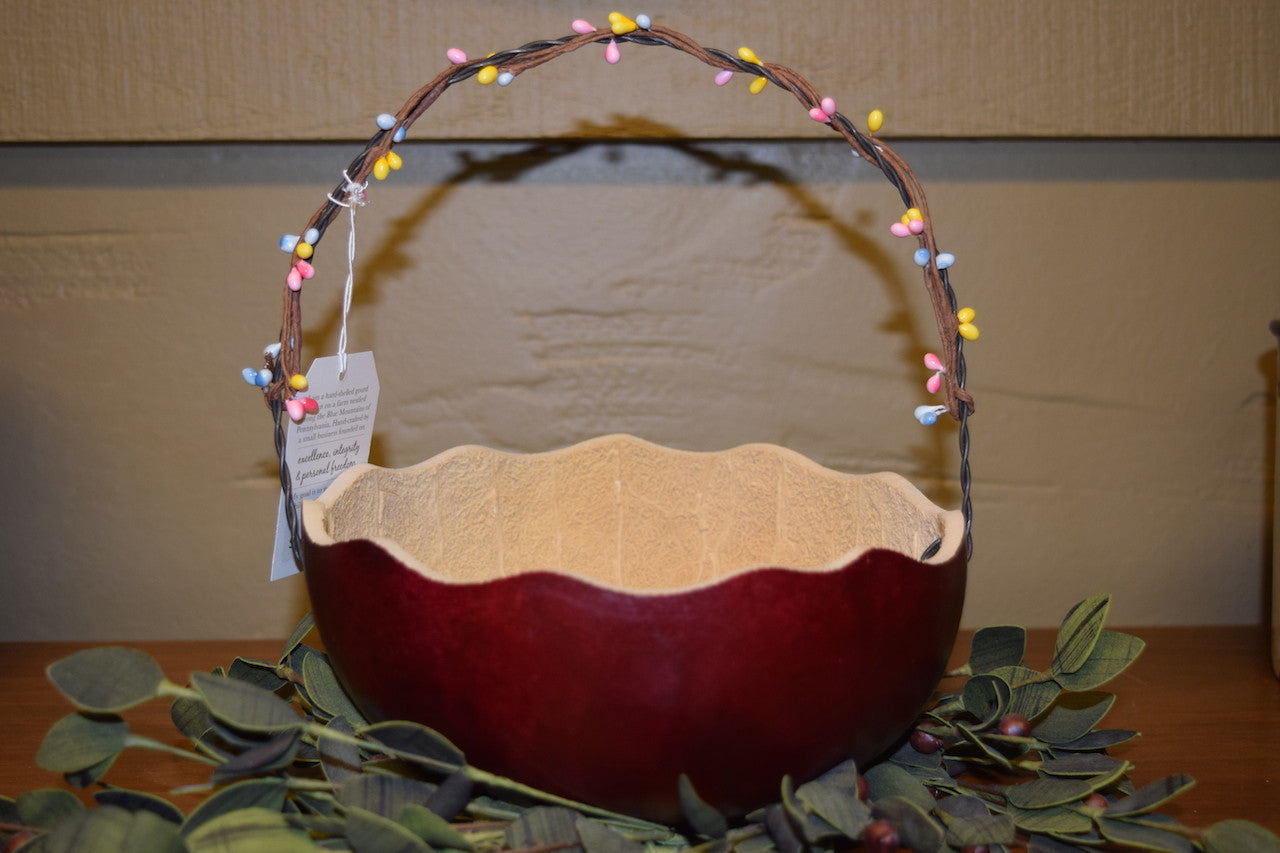 This basket is great for sharing your Easter candy, eggs, or carrots. The handle is decorated with spring-colored berries and the basket has a scalloped edge. This basket is red in color and approximately 7” in diameter.