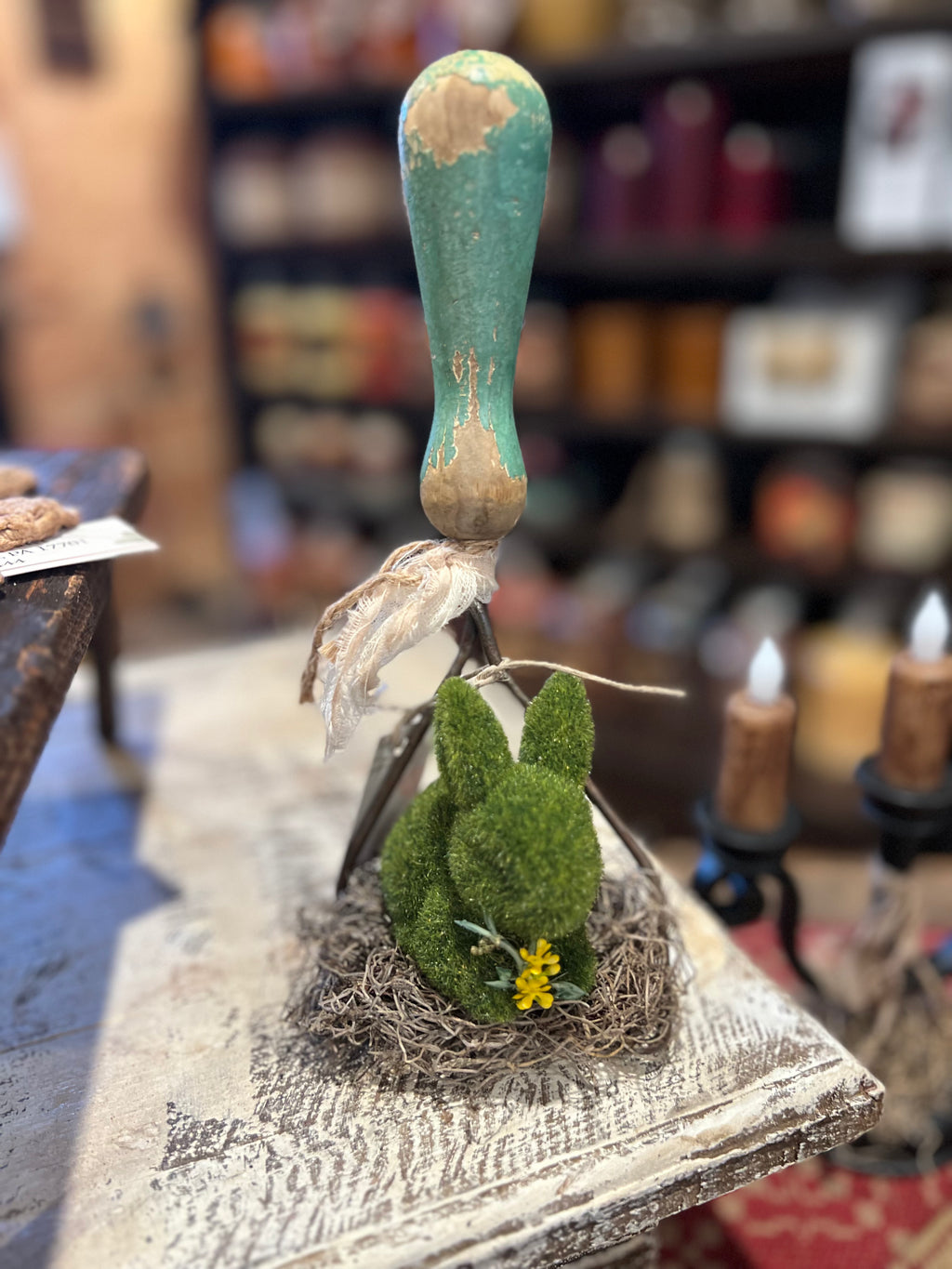 Fuzzy Sitting Bunny On Vintage Masher w/ Green Wood Handle