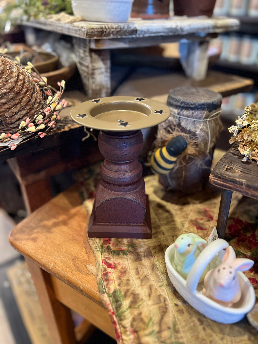 Wooden Burgundy Candle Holder w/ Tin Pan