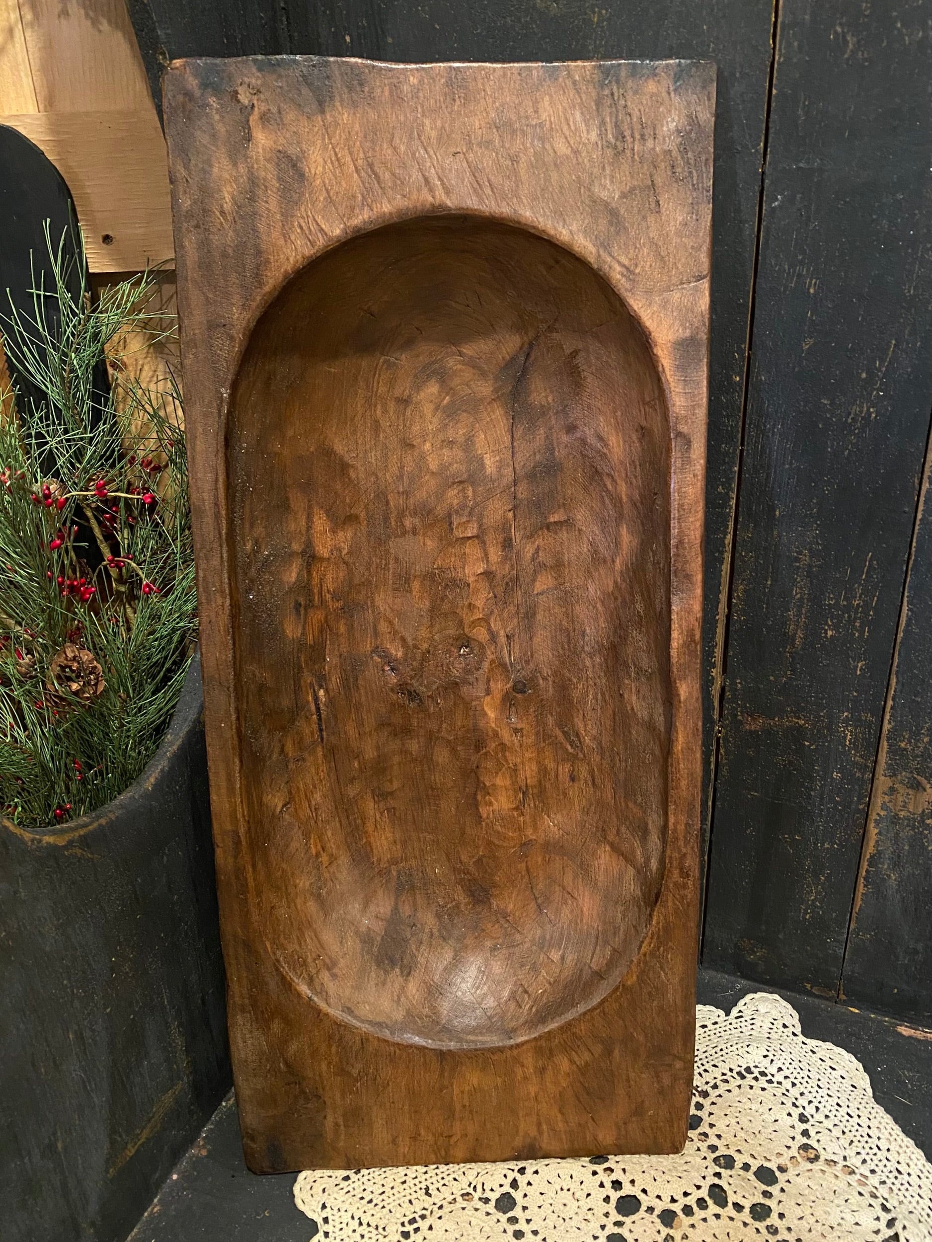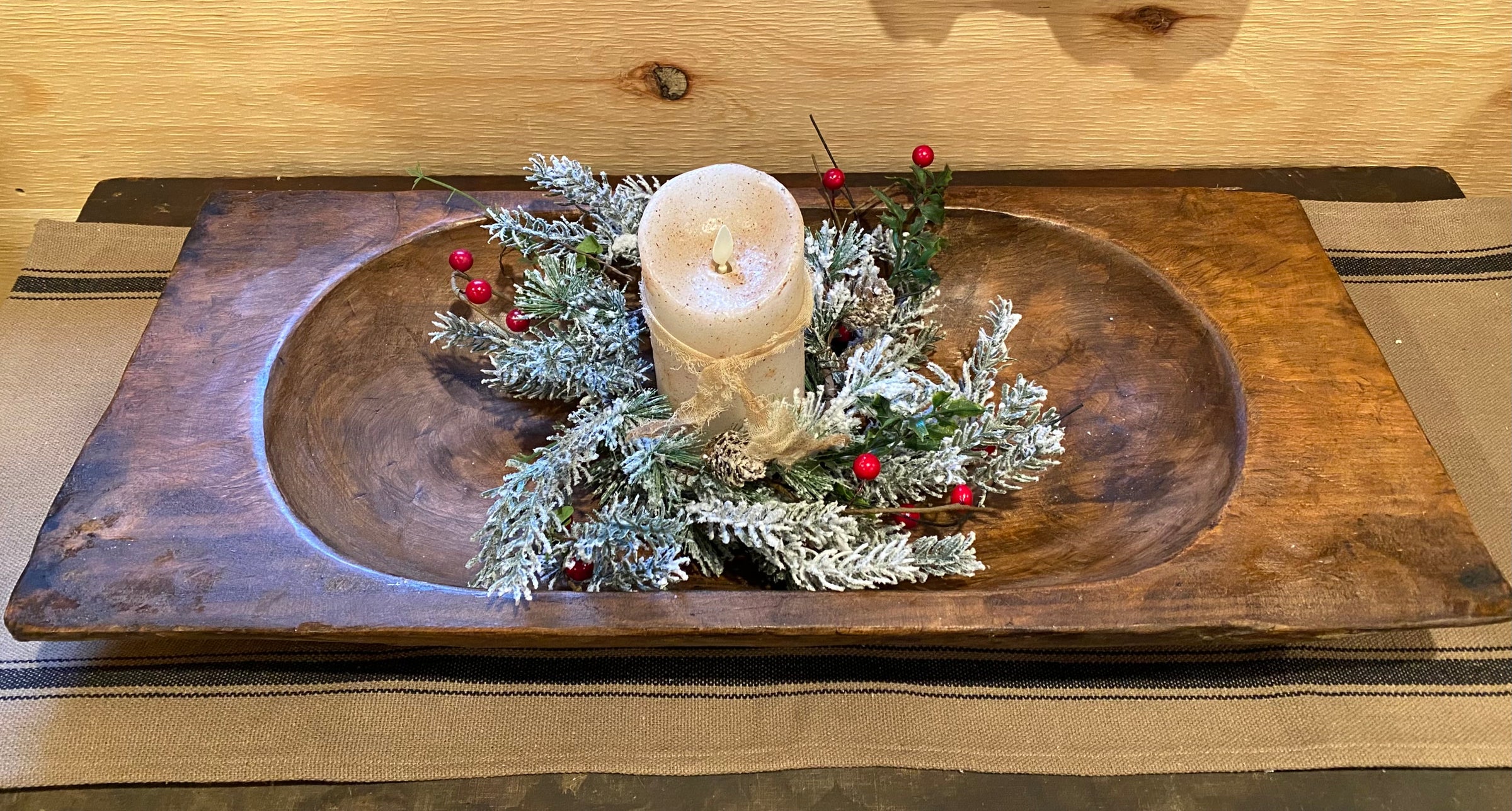 The Classic Wood Dough Bowl is a decorative oval-shaped bowl made of thick carved wood with a dark brown finish. The bowl has flat handled edges and can be used year-round or displayed seasonally, perfect to use for a dining table centerpiece, or placed on a shelf or hearth. Fill with florals, greenery, candles, beaded garlands, potpourri, or other bowl fillers for a lush and lovely display. Measures 3” high by 25” long by 11” wide.