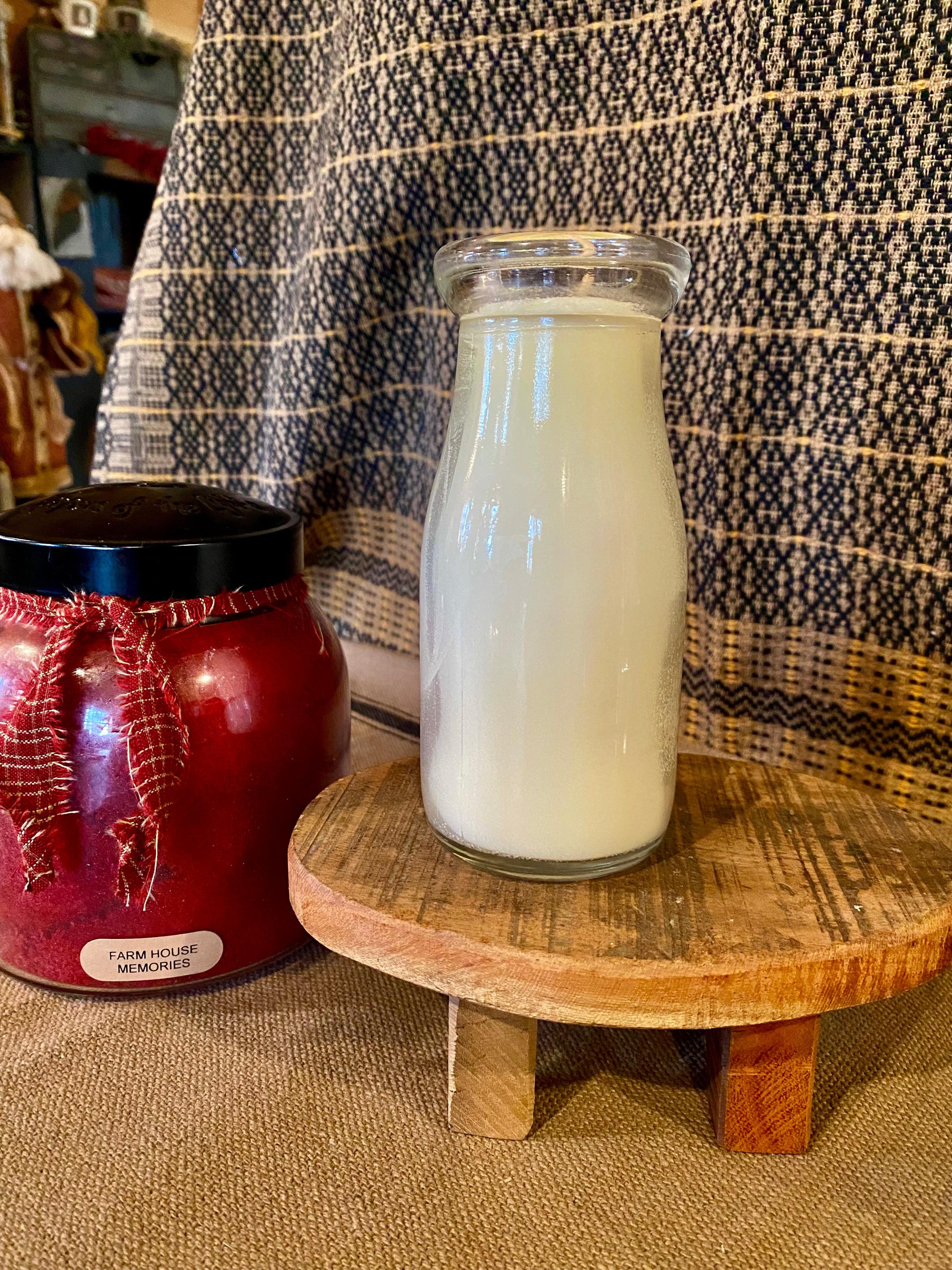 This glass jar candle looks just like a bottle of milk.  Add to a kitchen or dining room for the perfect final touch for any primitive or county grouping.